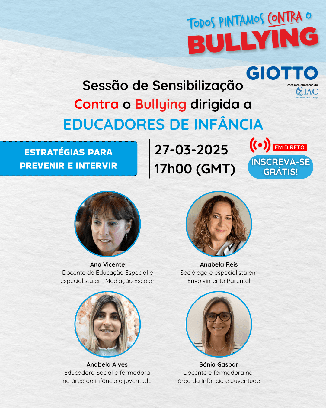 Por este motivo, a GIOTTO, em conjunto com o IAC, vão realizar uma sessão especial contra o Bullying dirigida aos Educadores de Infância, na terça-feira, dia 2 de DEZEMBRO, pelas 17h00 (GMT).