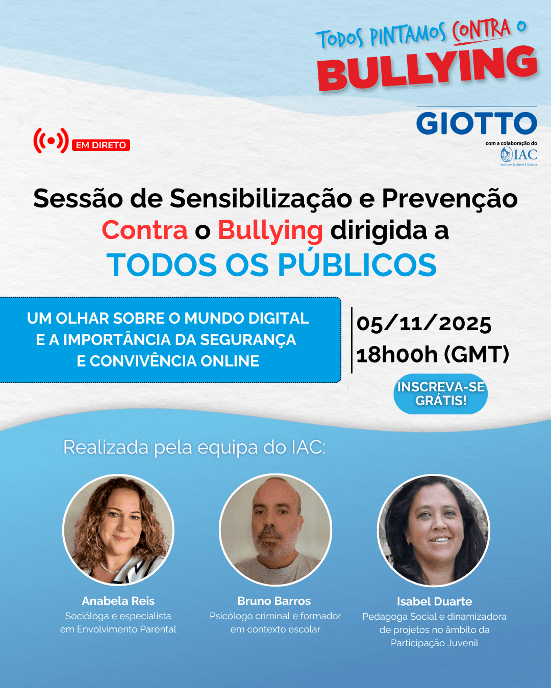 De facto, 1 em cada 3 alunos em Portugal foi vítima de Bullying e 7,7% das famílias afirmam acreditar que o seu filho foi vítima. Por isso, a GIOTTO, em conjunto com o IAC, vai realizar uma sessão dirigida a TODOS os PÚBLICOS – Especial, no âmbito do Dia Internacional contra a Violência e o Bullying na Escola, incluindo o Cyberbullying, no próximo 5 de NOVEMBRO, às 18h00 (GMT).